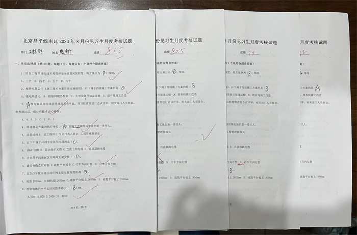 为了提高见习生理论知识和学习能力,加快理论走向实际的步伐,为早日成为一名合格的助理工程师打下坚实的基础。8月24日晚上,北京昌平线南延工程项目部开展见习生8月月度考核工作,采用试卷答题方式进行考核,试题由项目部各专业工程师出题,项目领导班子监考、阅卷。