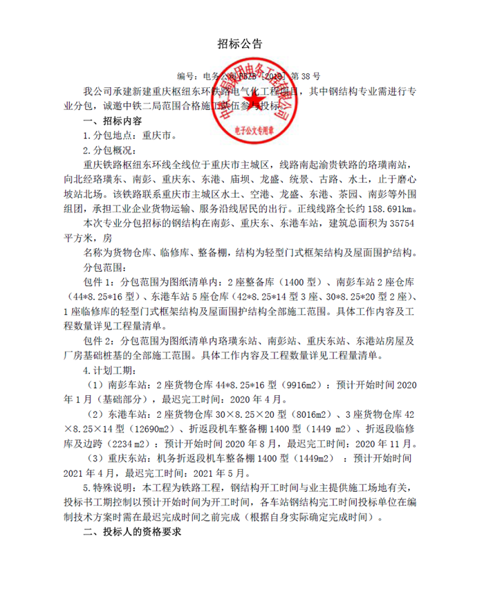 【招标公告】新建重庆枢纽东环铁路电气化工程项目