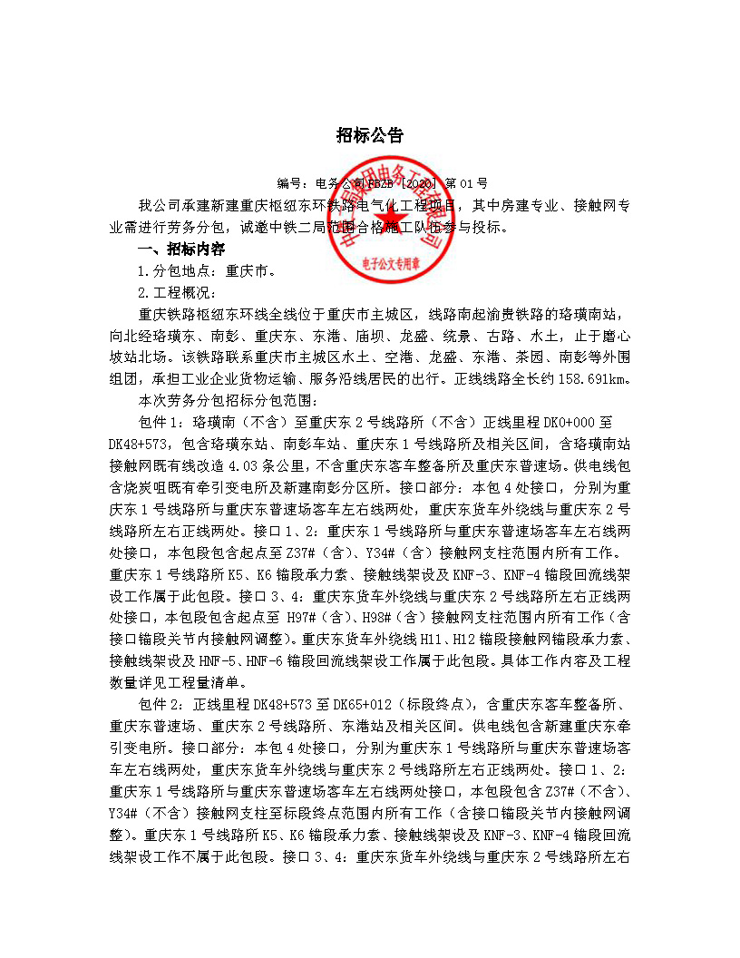 【招标公告】-重庆枢纽东环铁路电气化工程-房建、接触网劳务分包