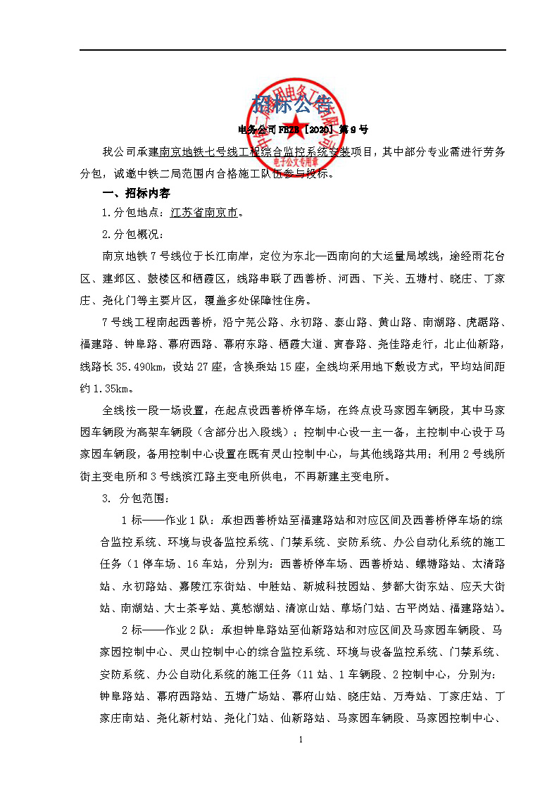 【招标公告】北京市轨道交通昌平线南延工程(西二旗至蓟门桥段)供电系统及综合监控系统设备安装工程