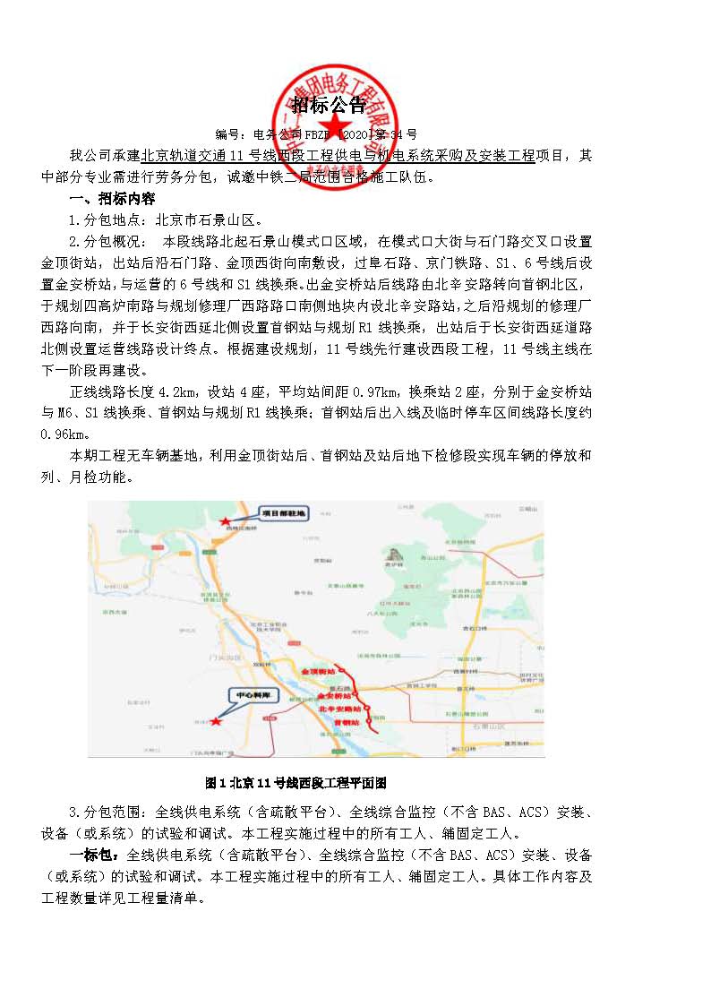 【招标公告】-北京轨道交通11号线西段工程供电与机电系统采购及安装工程项目