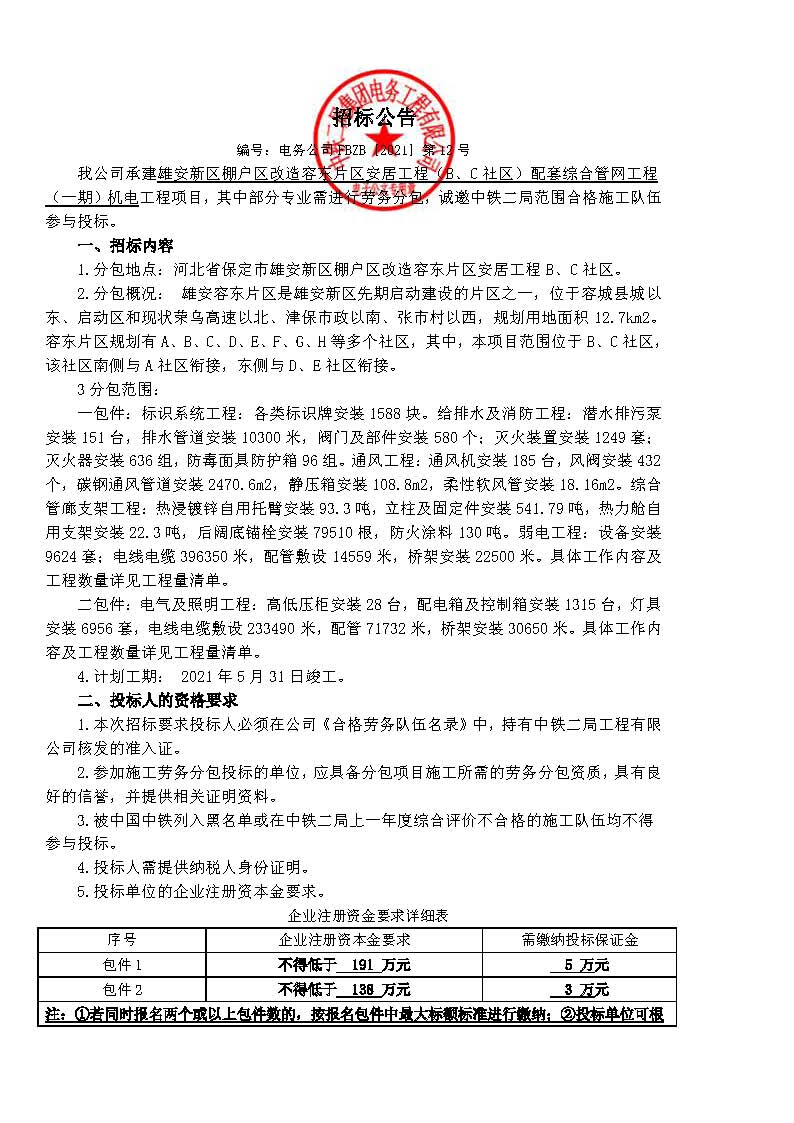 【招标公告】-雄安新区棚户区改造容东片区安居工程(B、C社区)配套综合管网工程(一期)机电工程项目