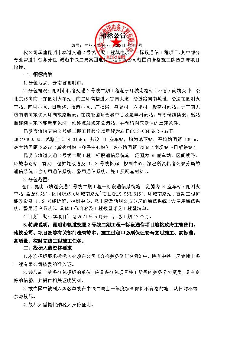 【招标公告】-昆明市轨道交通2号线二期工程机电项目一标段通信工程项目