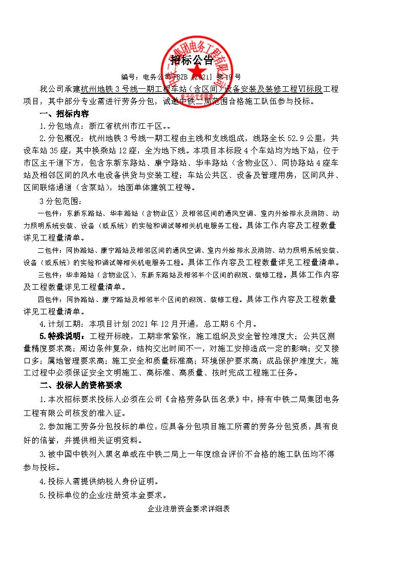 【招标公告】-杭州地铁3号线一期工程车站(含区间)设备安装及装修工程Ⅵ标项目