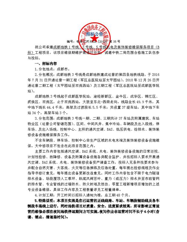 【招标公告】成都地铁1号线、3号线、5号线机电及装饰装修维保服务项目(B标)